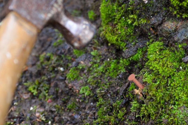 - Position one copper nail at the base of the tree and then use a hammer to drive it at a slightly downward angle.